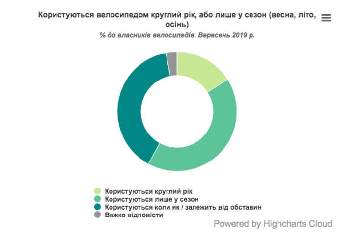 Найчастіше велосипед сприймають як «сезонний транспорт»: 42% українців користуються ним сезонно, 39% – залежно від обставин. Утім, 16% їздять велосипедом цілий рік.