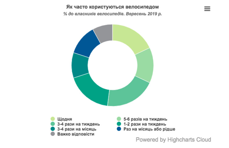 32% українців сідає на велосипед щодня, 38% – 2-4 рази на тиждень, 10% робить це раз на тиждень, а 12% – раз на місяць чи навіть менше.
