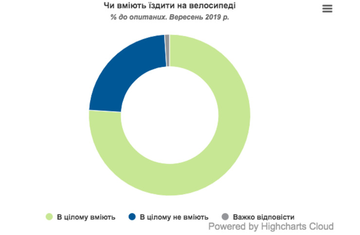 За результатами опитування, проведеного у вересні 2019 року, три чверті українців (76%) вміють їздити на велосипеді, і лише 23% не вміють.