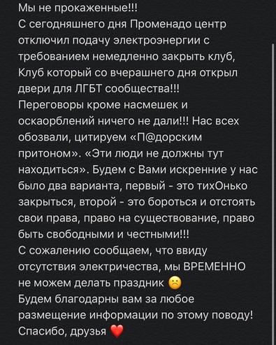 Ми попередили «Променаду Центр», що в нас будуть вечірки і буде багато людей з ЛГБТ спільноти. Нам дали добро і сказали, що все ок. Пізніше виявилося, що керівництво Променади не знало, що означає абревіатура ЛГБТ, а коли з’ясували, то вирішили відключити нам світло», – прокоментував ситуацію Данііл, представник клубу. – «Поліція, з якою ми домовлялися, почала тиснути на керівництво ТЦ, в сенсі “це непотрібно ні вам, ні нам, вживайте заходів”. Зрештою, проблема зі світлом перед вікриттям 30 жовтня вирішилася, і ми написали гарантійний лист, що беремо всю відповідальність на себе».