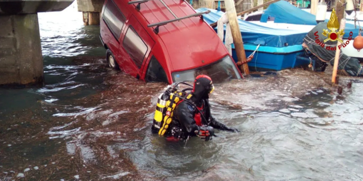 Пожежний у водолазному спорядженні біля затопленої автіки. Фото: Vigili del Fuoco via Reuters