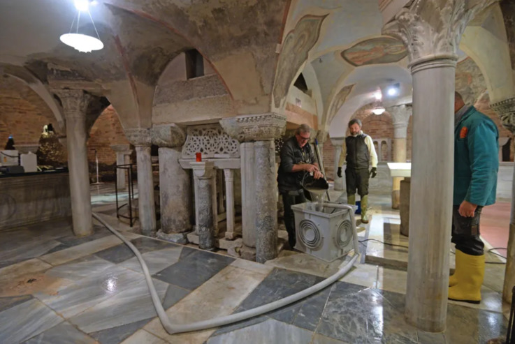 Робітники прибирають залишки води в склепі під базилікою Сан-Марко. Фото: Andrea Merola/EPA