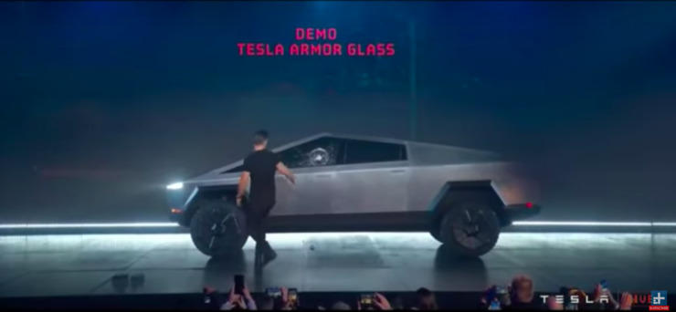 Корпус автомобіля зроблений з нержавіючої сталі, а скло броньоване за власною технологією компанії. На презентації заявили, що метал витримує обстріл з дев’ятиміліметрового пістолета. Утім, коли Маск попросив помічника метнути в скло металічний шар, воно тріснуло.