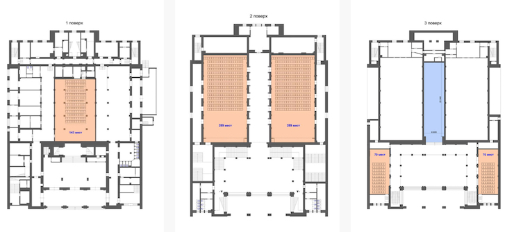 Проєкт розташування зал 1, 2, 3 поверхів після ремонту. Надані «Сінема Сіті»