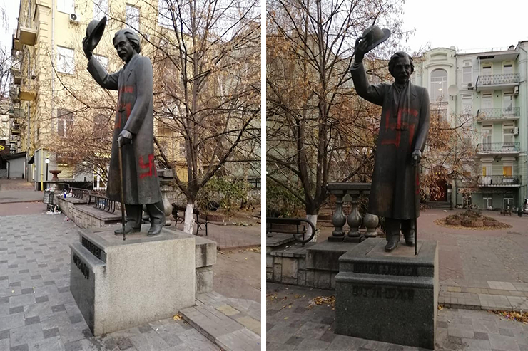 25 листопада представники єврейської громади помітили, що пам’ятник письменнику Шолом-Алейхему на вулиці Рогнідинській у центрі Києва розмальовано свастиками. Зокрема, фото опублікував головний рабин хасидів Моше-Реувен Асман.