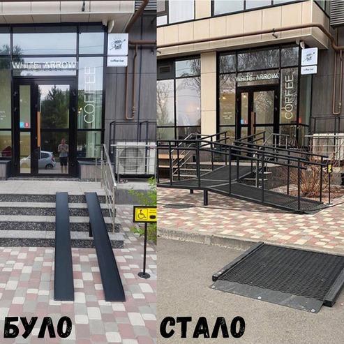 Відвідувач кав’ярні «Біла стріла» в Дніпрі поскаржився на брак доступу до закладу для людей з інвалідністю. Після того власники вирішили зробити її доступною, встановивши незручні рейки поверх сходів.