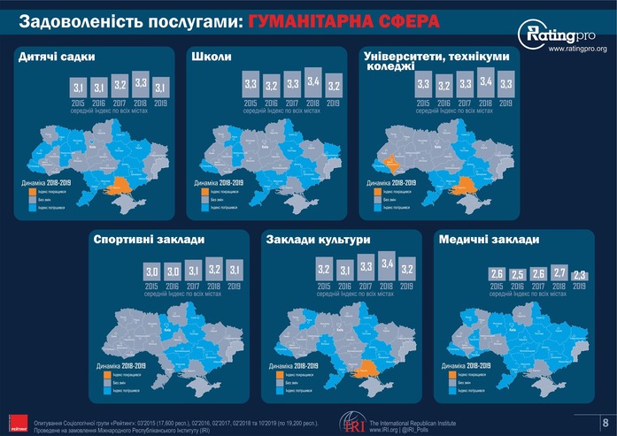 Задоволеність послугами гуманітарної сфери впала порівняно з минулим роком. Загалом в Україні спортнивні заклади, заклади культури, школи, університети, технікуми та коледжі, дитячі садки не виправдовують очікувань користувачів. Індекс закладів культури та дитячих садків зріс лише в Херсонській області. Індекс медичних закладів переважно стабільний.