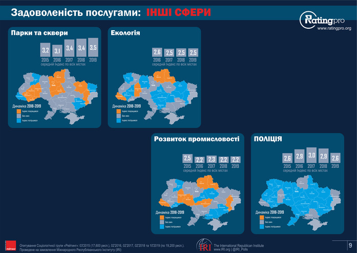 Екологічна ситуація покращилася в Чернігівській, Сумській, Хмельницькій, Закарпатській областях. Жителі дев’яти областей України (серед них Київ) стали більше задоволеними якістю парків та скверів. Проте в одинадцяти областях стан парків погіршився (серед них Дніпропетровська, Львівська, Житомирська, Вінницька області).