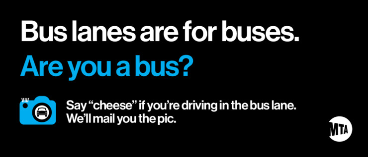 Транспортна компанія Нью-Йорка, Metropolitan Transportation Authority (MTA), розпочала інформаційну кампанію довкола програми контролю за правомірним використанням автобусних смуг. На дорогах міста з’явилися таблички з жартівливими питаннями: «А ти автобус?», пише amNewYork