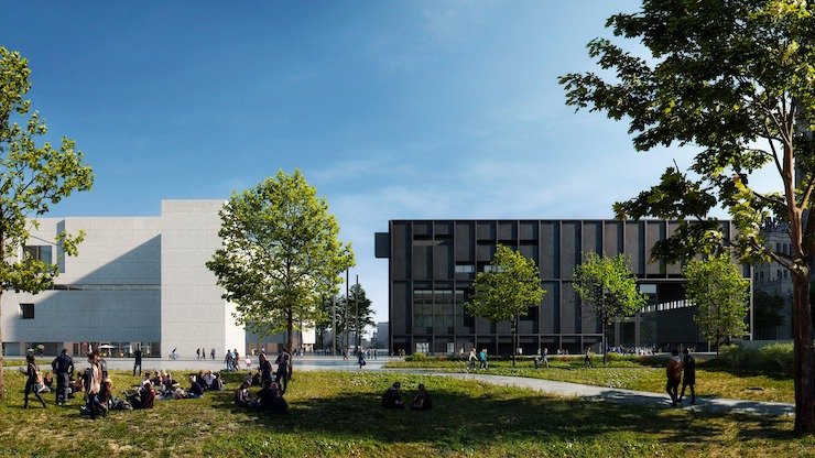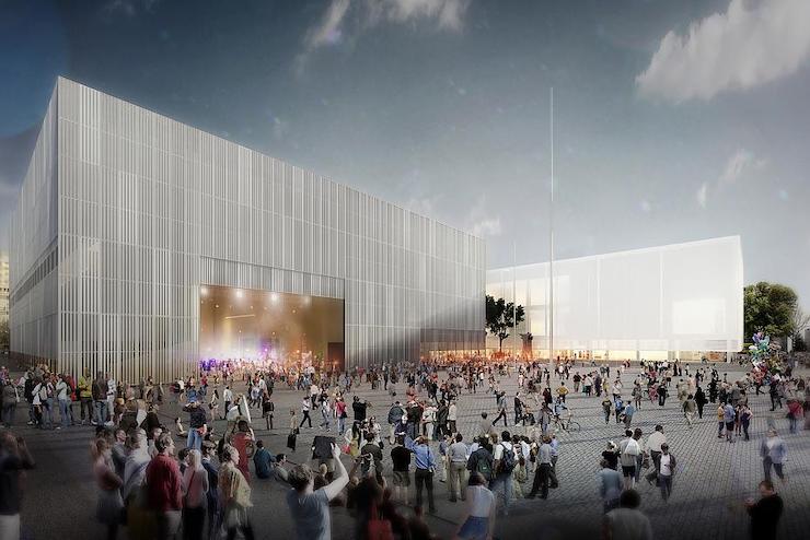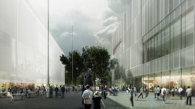 Публічний простір між Музеєм сучасного мистецтва (ліворуч) та Театром TR (праворуч). Візуалізація: Thomas Phifer and Partners
