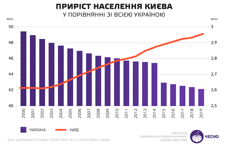 «Чесно» зазначає, що Київ демонструє дещо вищі темпи зростання населення порівняно з іншими європейськими столицями. При цьому офіційні дані не в повній мірі відображають проживання в Києві внутрішньо переміщених осіб.