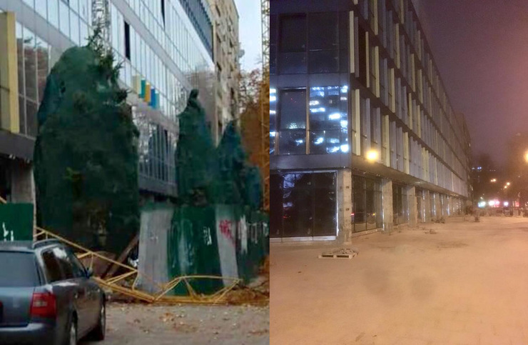 «Експеримент з накриття ялинок мішками під час будівництва успішно завершено: ялинки витримали і відповідно спиляні. Тепер значно краще видно оригінальний фасад, що яскраво замінив ту моденістську бетонну пластику», – прокоментував у мережі вирубку дерев доцент КНУБА Глеб Ушаков.