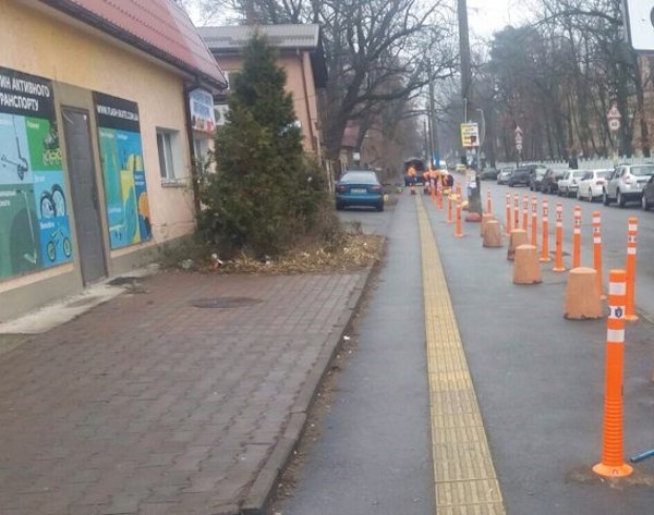 Зазначимо, що делінеатори не завжди запобігають паркуванню. Так, на Вознесенському узвозі встановили стовпчики між смугами руху. Якщо раніше водії масово залишали авто вздовж узбіч, то тепер паркуються просто на тротуарах.