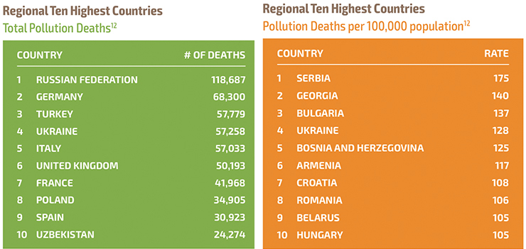 В європейському регіоні топ-5 за кількістю смертей на 100 тисяч осіб виглядає так: 1) Сербія, 2) Грузія, 3) Болгарія, 4) Україна, 5) Боснія і Герцеговина. Загалом у 2017 році в Україні померло від забруднення довкілля понад 57 тисяч людей.