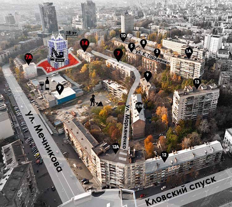 Там планували звести 35-поверхівку з підземним паркінгом на чотири поверхи, впритул до Олександрівської лікарні та житлових будинків. Будівельна техніка їздила через територію лікарні – пам’ятки архітектури місцевого значення. Активісти зупиняли транспорт, викликали поліцію та протистояли молодикам спортивної статури, що охороняли будівництво.