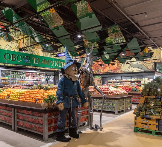 Фігури Бляшаного Лісоруба і Страшили у відділі «Овочі та фрукти» можуть потішити як дітей, так і дорослих.