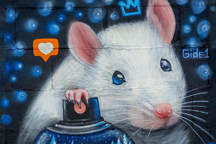 Переважно Гідеван малює тварин, але є й антропоморфні зображення. Каже, що найчастіше малював єнотів – чотири штуки в різних частинах Києва. Напередодні Нового року він намалював на набережній Дніпра пацюка, який тримає балончик із фарбою.
