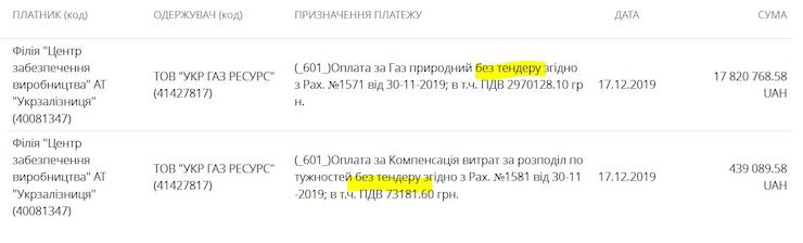 У грудні компанія «Укр газ ресурс» отримала від філії «Укрзалізниці» – «Центру забезпечення виробництва» – 17,82 мільйона гривень за природний газ і ще 440 тисяч гривень за його прокачку. Інформація про це міститься на державному порталі Spending.