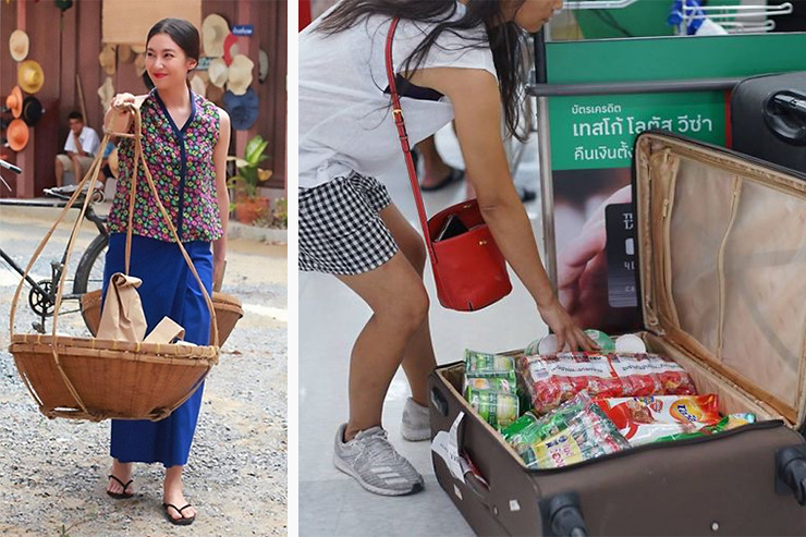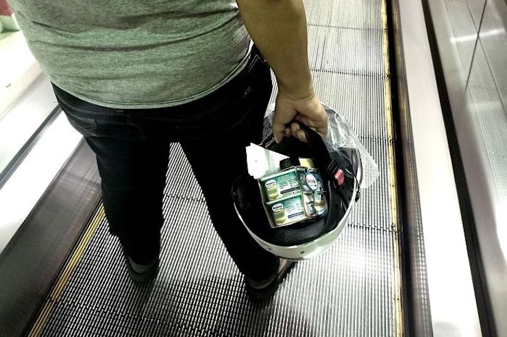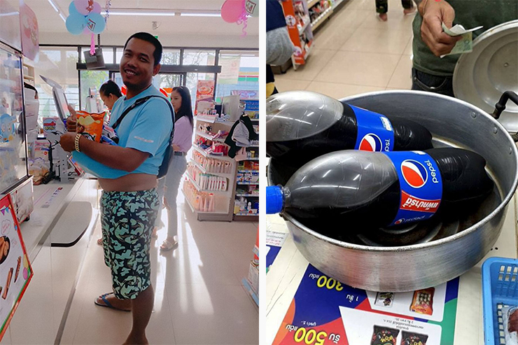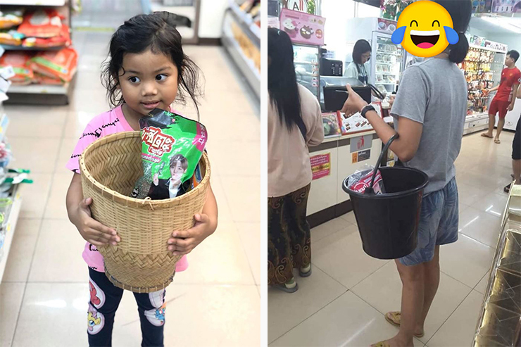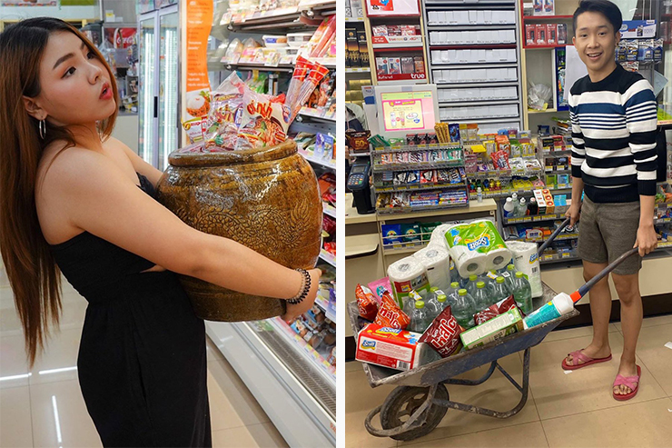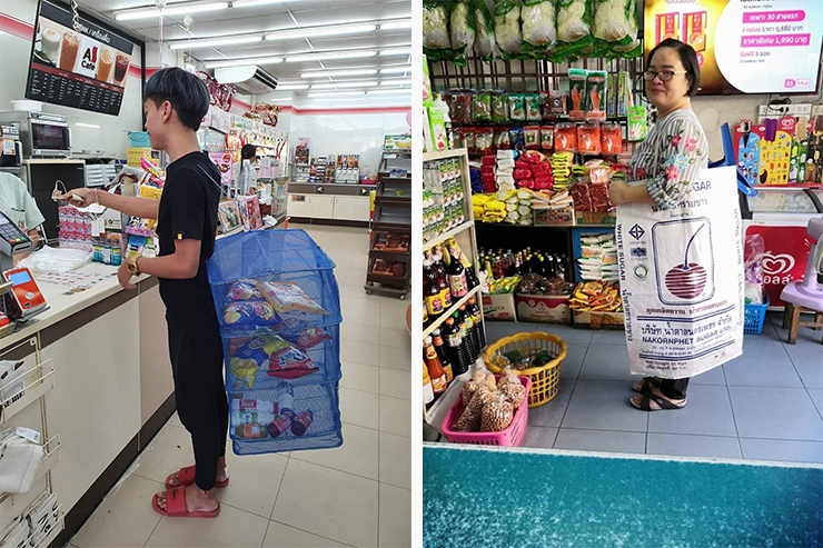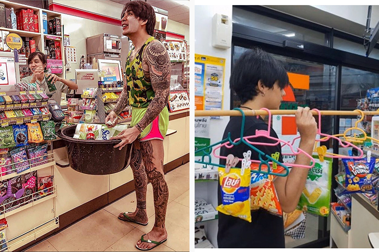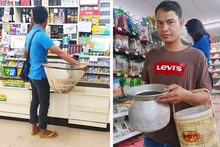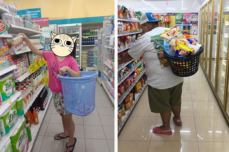 Тайці приходять до магазину з тачками, корзинами, відрами, горщиками, мисками, валізами, кастрюлями, квітковими вазонами і навіть паркувальними конусами, а ще загортають товари у футболки та складають у мотошоломи.