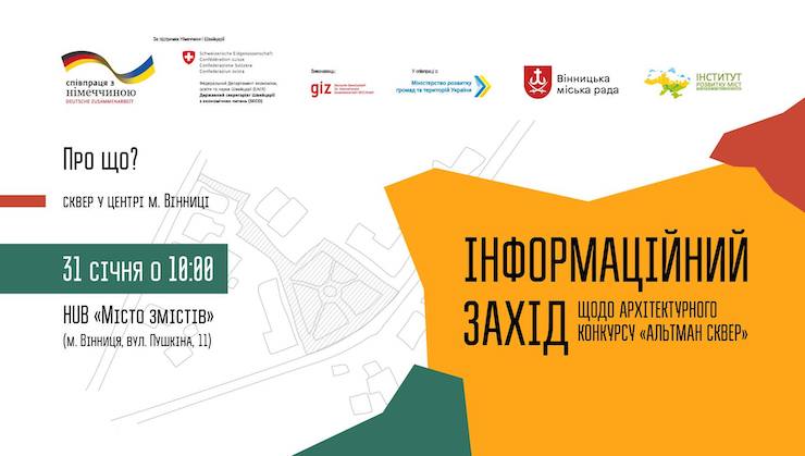 Зацікавлених запрошують відвідати інформаційний захід, на якому обговорюватимуть конкурс і перспективи скверу. Він відбудеться 31 січня о 10:00 у хабі «Місто змістів» (Вінниця, вулиця Пушкіна, 11).