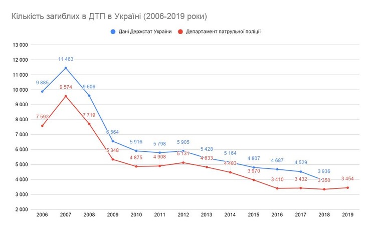 Патрульна поліція оприлюднила статистику ДТП за 2019 рік. Згідно з цими даними загинуло 3454 осіб, травмовано 32 736 осіб.