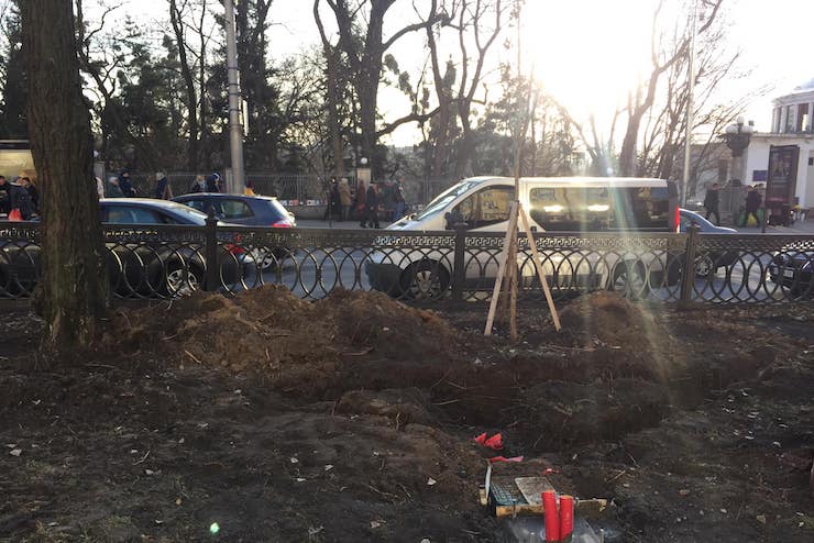 Нагадаємо, що під час реконструкції мережі освітлення на бульварі Шевченка робітники пошкодили коріння дерев. Ветроградський помітив, що нову лінію освітлення проклали просто по кореневій системі тополь.
