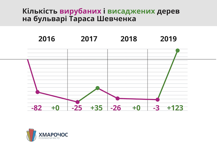 Скільки дерев зрубав «Київзеленбуд» на бульварі Шевченка за чотири роки? (інфографіка)
