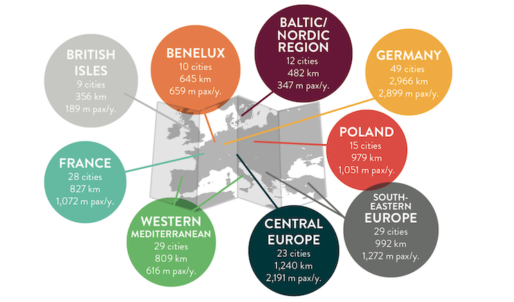 В Європі чимала частина пасажиропотоку припадає на Німеччину. Протяжність ліній легкорейкового транспорту в 49 німецьких містах складає майже 3000 кілометрів, а річний пасажиропотік у 2018 році становив 2900 мільйонів людей. Зокрема, протяжність трамвайної мережі в Берліні складає рекордні для європейського міста 193 кілометри.