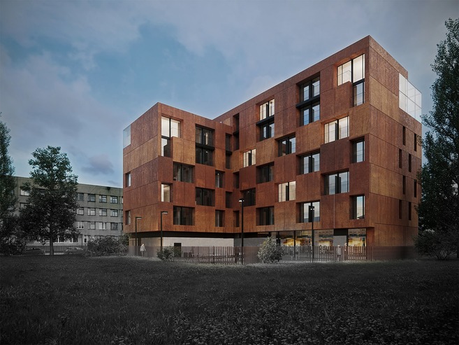 Завдяки покриттю кортеновою сталлю з плином часу готель набуватиме все іншого забарвлення – від сірого до багряно-коричневого. Як розповів «Хмарочосу» Мирослав Дзвонковський, архітектор TRDZ, «це надає споруді індустріального післясмаку». Над проєктом, окрім Мирослава, працювали архітектори Олег Трофименко та Андрій Дідюк, інженер-конструктор Андрій Свідрик.