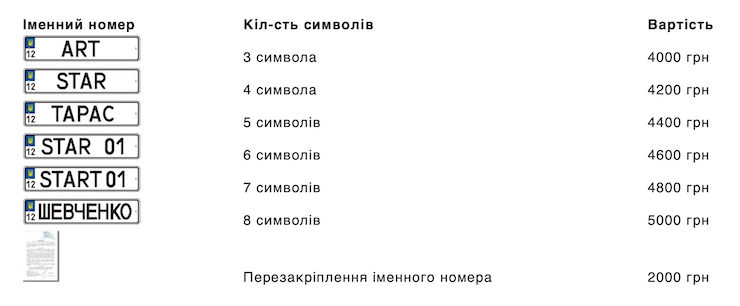 Мінімальна кількість символів на номерному знаку – три. Безпосередньо в МВС такий номер коштуватиме 300 гривень. Кожен наступний символ – плюс 90 гривень. Максимум номер може містити вісім символів. Також можна використовувати графічні елементи, вартість одного – 500 гривень.