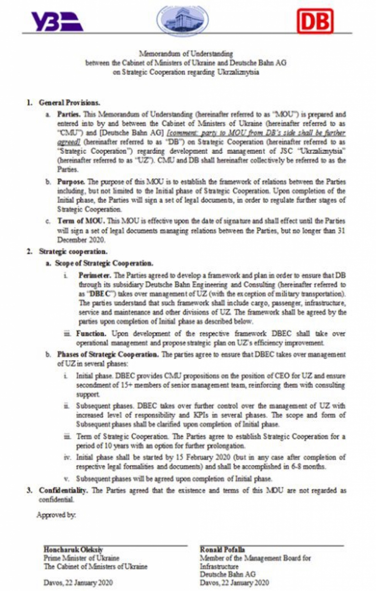 ЗМІ поширюють нібито документ меморандуму, який було опубліковано в анонімному Telegram-каналі інсайдерської інформації «Шептун». У ньому йдеться про те, що Deutsche Bahn «бере на себе керівництво Укрзалізницею», включно з підрозділами вантажних і пасажирських перевезень, за виключенням військового транспорту. Цей документ може бути фейком.