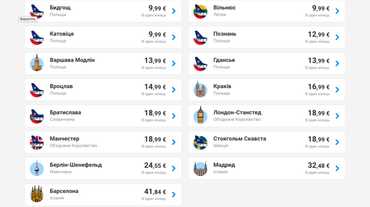 Акція діє на рейси з Києва (аеропорт «Бориспіль») та Львова. За десять євро можна відшукати квитки до Катовіце і Бидгоща в Польщі, до Вільнюса (Литва). За ціною до 20 євро можна встигнути придбати квитки до Катовіце, Варшави, Ґданська, Познані, Вроцлава, Кракова (Польща), Лондона і Манчестера (Велика Британія), Стокгольма (Швеція) і Братислави (Словаччина).