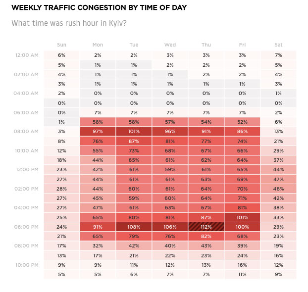 «Якщо ви подорожуватимете в четвер о 19 годині, то можете зберегти до семи годин на рік (в межах 30-хвилинної поїздки)», – пишуть аналітики TomTom.