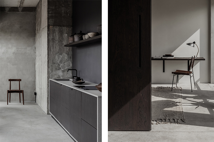 Крім бетону дизайнерка використала обпалену деревину дуба. З темного дерева зроблено розсувні стіни, які зонують простір, робочий стіл, втоплений у стіну стелаж та кухонні корпусні меблі.
