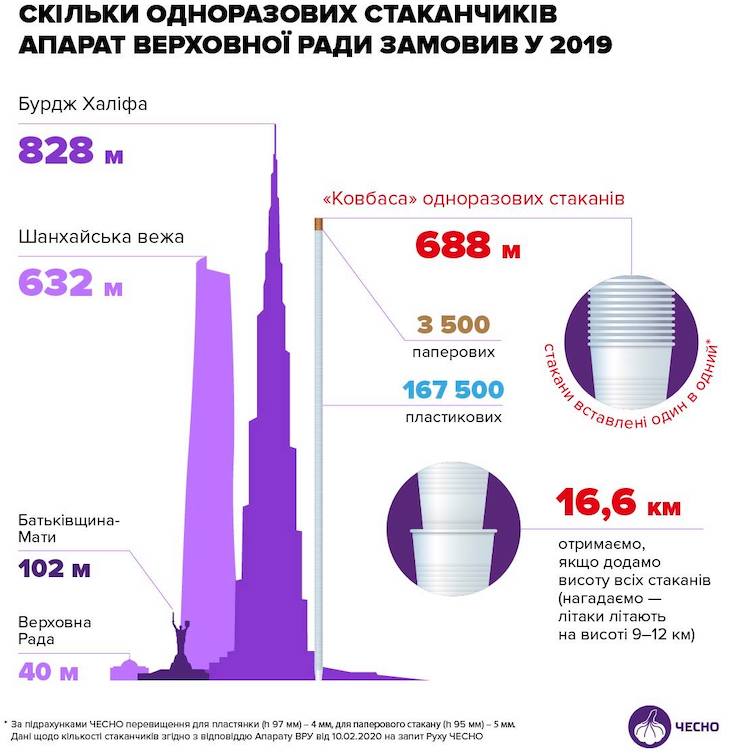 У 2019 році Апарат Верховної Ради України придбав 171 тисяч одноразових стаканчиків. Про це стало відомо з відповіді на запит Чесно.