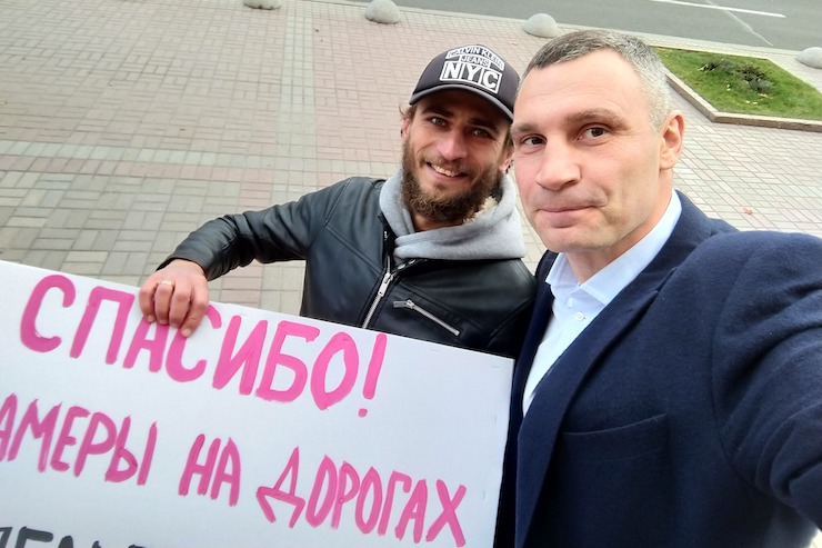 Мер Києва Віталій Кличко сфотографувався з киянином Олексієм, який стояв під будівлею мерії з плакатом «Дякую за евакуатори на дорогах».