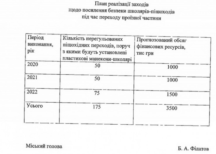 Згідно з проєктом рішення, цьогоріч планується встановити муляжі на 50 пішохідних переходах, на що витратять мільйон гривень. Ще один мільйон гривень пропонують витратити на фігури школярів у 2021 році, і півтора мільйона – у 2022-му.
