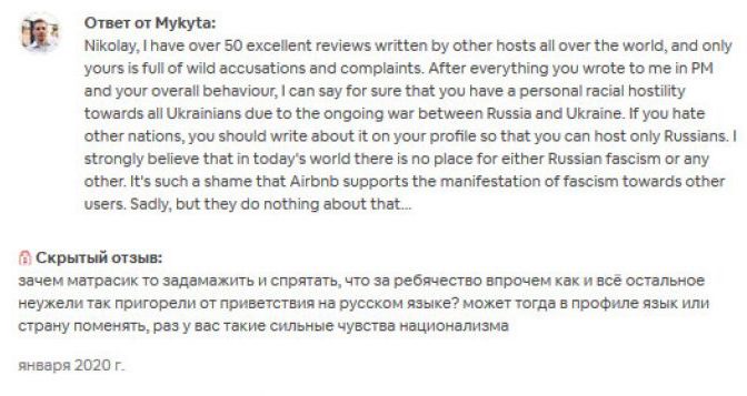 Зрештою господар, зареєстрований на Airbnb під ім’ям Нік Максимов, залишив негативний відгук разом із прихованим коментарем, в якому назвав Нікіту «українським нацистом», який ненавидить російську мову.