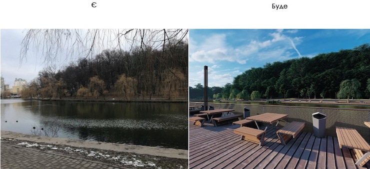 Дитячі та спортивні майданчики, кажуть у Київзеленбуді, встановлюватимуть на місці вже існуючих конструкцій; фудкорти – на місці нелегальних кіосків та автокав’ярень. Столики біля водойми будуть публічним простором, не «приватизованим» підприємцями.