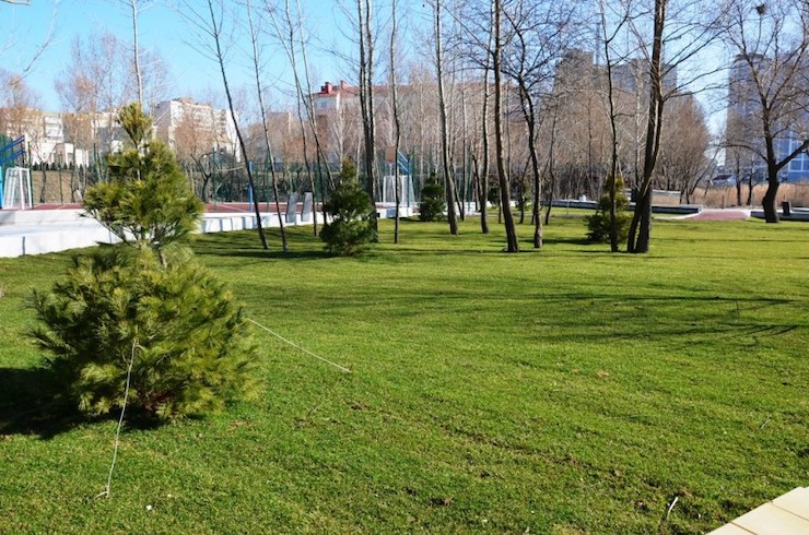 Покриття з фібробетону, парапетні лави та зелені газони – так облаштували територію біля нового ЖК.