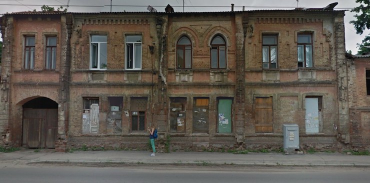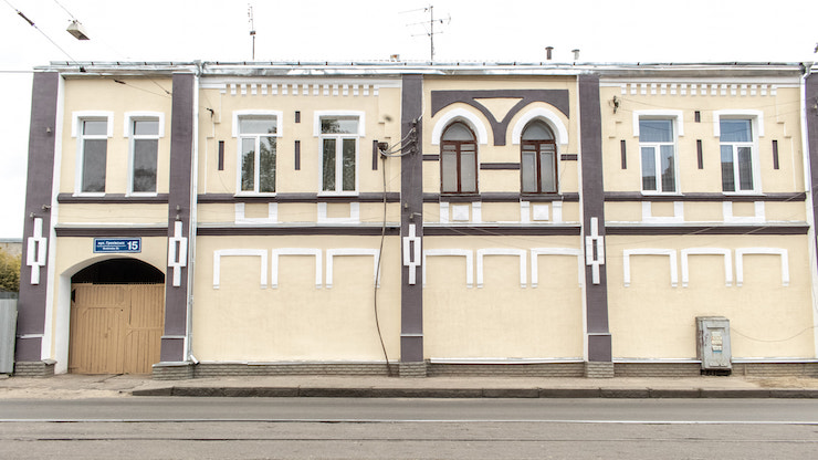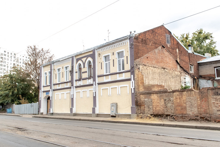 На вулиці Греківській у Харкові оновили старовинний двоповерховий будинок, закривши цегляний фасад тиньком та замурувавши всі вікна на першому поверсі.
