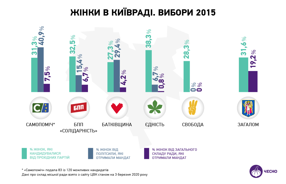 А ця інфографіка показує гендерний розподіл у списках партій на виборах до Київради у 2015 році. Зокрема, вона показує, що партії висували жінок, але виборці їх не обирали.