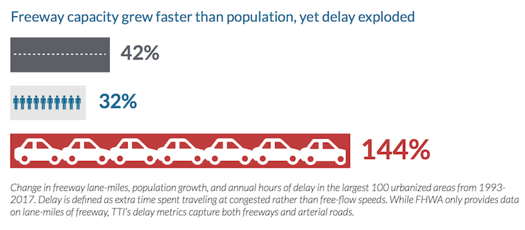 У період між 1993 та 2017 роками у США було збудовано понад 30 тисяч нових магістралей у сотні найнаселеніших міст. Кількість кілометрів нових доріг зросла на 42% при тому, що населення цих міст за той же період зросло на 32%.