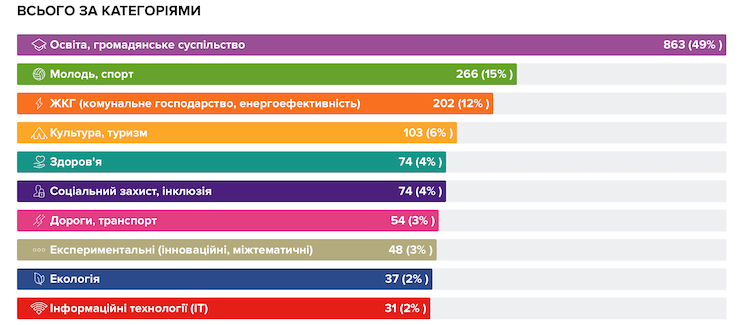 Найбільше проєктів подавали у категорії освіта і громадянське суспільство. Також чимало пропозицій за напрямками спорт і ЖКГ.