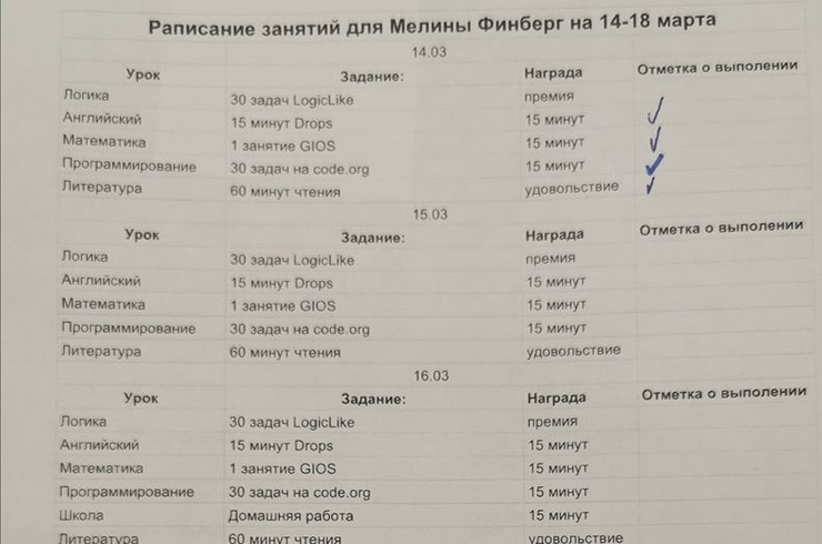 Так виглядає розклад 10-річної доньки Арсенія Меліни. Фото зі сторінки Арсенія Фінберга у Facebook