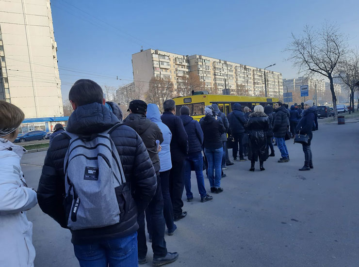 На деяких зупинках в Києві утворились великі скупчення пасажирів, які чекають на громадський транспорт. Це сталось після того, як вчора, 17 березня, о 23:00 перестав працювати метрополітен.
