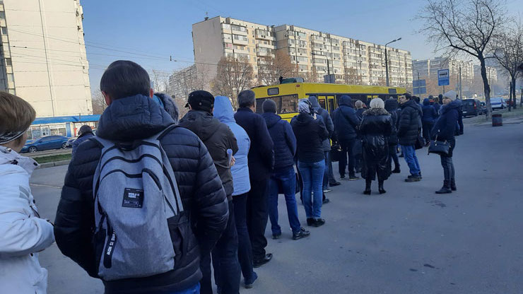 Водночас на деяких зупинках у Києві утворились великі скупчення пасажирів, а в громадський транспорт заходило значно більше 10 осіб. У «Київпастрансі» погрожують звільняти водіїв, які пускатимуть у транспорт більше десяти пасажирів.