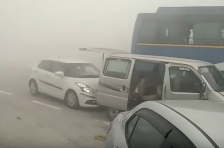 Аварія, в яку через обмежену видимість, спричинену смогом, на хайвеї поблизу Делі потрапили 24 автівки. Скрін з відео VOX.
