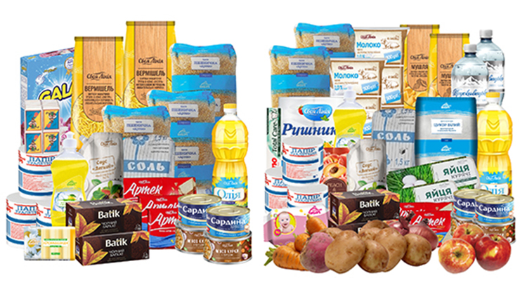 Клієнтам пропонують три набори необхідних товарів вартістю 408, 510 і 714 гривень. У набори входить туалетний папір, сіль, мило, олія, яйця, молоко, крупи, цукор, яблука, овочі з «борщового набору» тощо. Вартість доставки складатиме 60-75 грн.