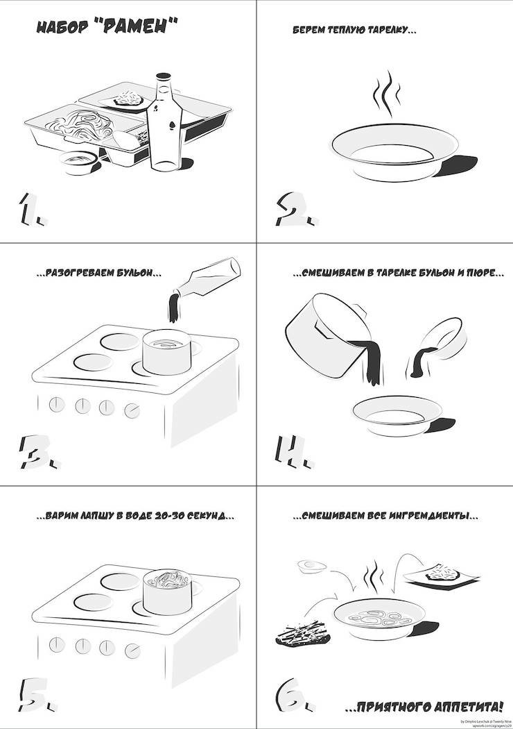 Складові рамена запаковано окремо: бульйон наливають у пляшку, локшину доставляють сирою. Її необхідно буде зварити згідно з інструкцією. Ramen vs Marketing створили схему, як приготувати рамен зі складових.
